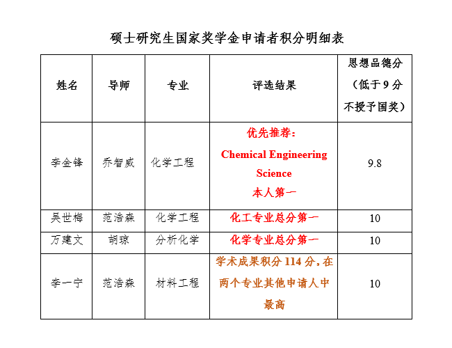 研究生奖学金评审委员会评审,拟推荐李金锋(2022级化学工程)、吴世梅(2022级化学工程)、万建文(2022级分析化学)、李一宁(2022级材料工程)4位同学为2024年av电影
