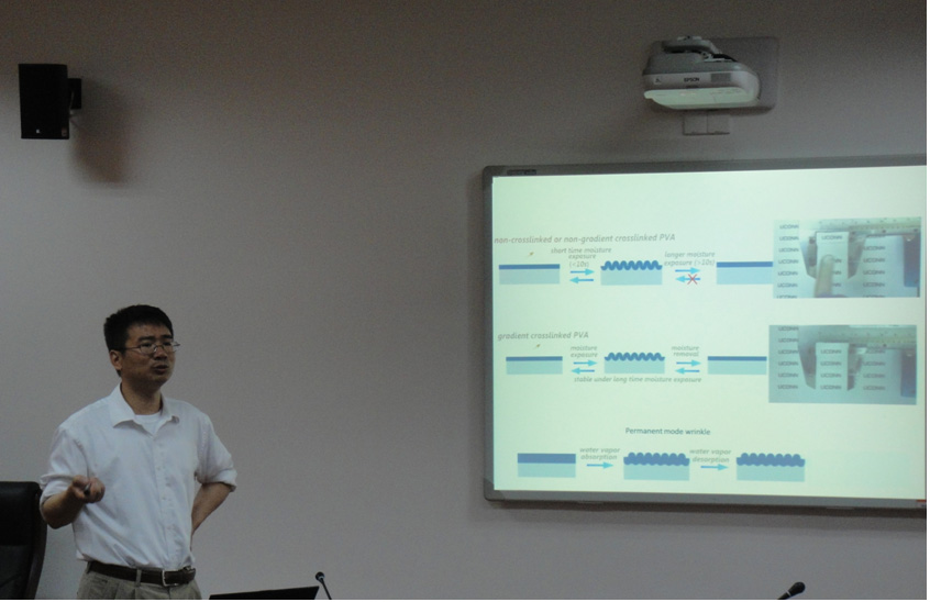 孙陆逸副教授研究领域涉及多功能纳米材料、聚合物材料、绿色化学和工程以及水合物和多孔材料等方面,报告介绍了其研究团队在层状材料研究方面的最新进展。孙陆逸副教授的研究团队开创性地以聚合物以及可溶盐为原料,直接用一步法成功合成插层化合物。该方法的提出,为插层化合物的制备开辟一个新的途径。合成的新型有机-无机插层复合材料,无机成份高达70%以上,具有高的阻燃性,阻氧和阻水性,在一些建筑商业上具有很大应用前景;采用交联的方法合成可控的对水蒸气敏感的插层复合材料,在军事方面具有很大的应用。孙陆逸副教授与教师们就相关领域科研问题进行了讨论,并介绍了其学校和科研所的环境和条件,表示欢迎我校教师去访问学习。(撰稿:王玉飞、王静,摄影:郭仕恒)