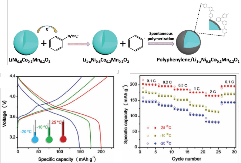 近日,我学院分析科学技术研究中心牛利教授团队和北京大学郭少军研究员团队合作在锂离子电池三元正极材料研究方面取得重要进展,报道了一种自发重氮盐接枝的软化学方法,成功在三元正极材料表面修饰了一层共轭聚合物(聚苯),以形成polyphenylene/LiNi0.6Co0.2Mn0.2O2复合正极材料。该聚合物层具有优异的电子/离子导电率,并且具有三维有序的多孔结构,显著地提升了锂离子电池的低温电化学性能。该研究成果最近发表在能源类国际顶级期刊《Advanced Energy Materials》 (IF=21.875)上,av电影