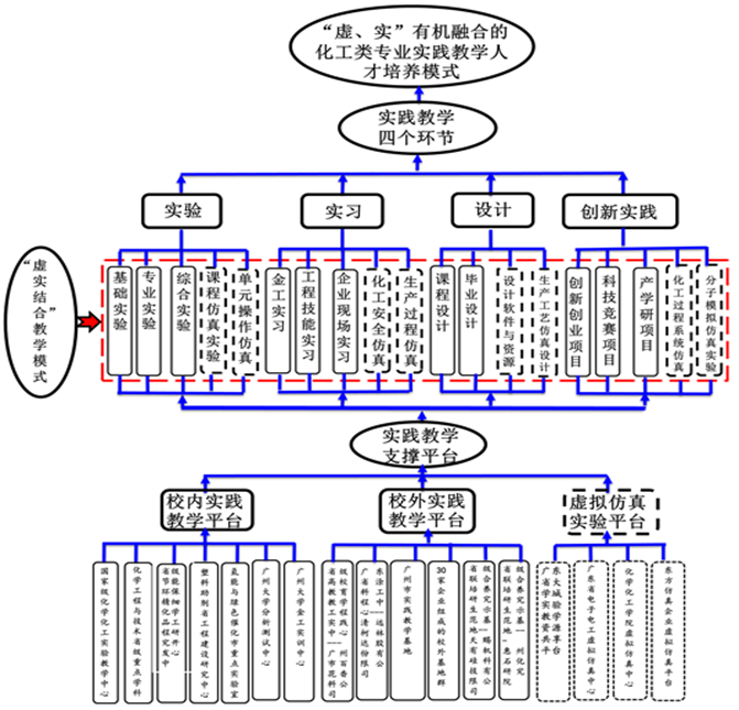 项目组从2009年承担“化工专业实验教学创新人才培养模式和方法的探索与实践”广东省教学改革项目开始,不断对实践教学在人才培养过程中的模式和方法持续研究,特别是针对本科专业实践教学在人才培养过程中的作用和有效性落实不足、虚拟仿真教学资源缺乏特色的现状,探索工程人才培养模式的创新,开展“虚、实”有机融合的解决路径,提出有效解决方法,取得了明显的成效。项目以“教育部高等学校化学化工实验教学示范中心”为依托,对标“卓越工程师教育培养计划”,在专业实践教学中,采用“虚、实”有机融合的教学新模式,开发以项目为主线贯穿专业教学全过程仿真实验项目,构建开放共享“二实一虚”专业实践教学平台,旨在提高本科生工程能力和创新思维。