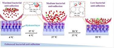 抗细菌黏附热响应增强技术:研究发现设计调控钛基复合材料P(VCL-co-QAS-co-PEGMA-co-VTMO)/TNTs/Ti表面的聚合物链的相转变温度,低温环境可实现抗细菌黏附热响应增强效应(图1);