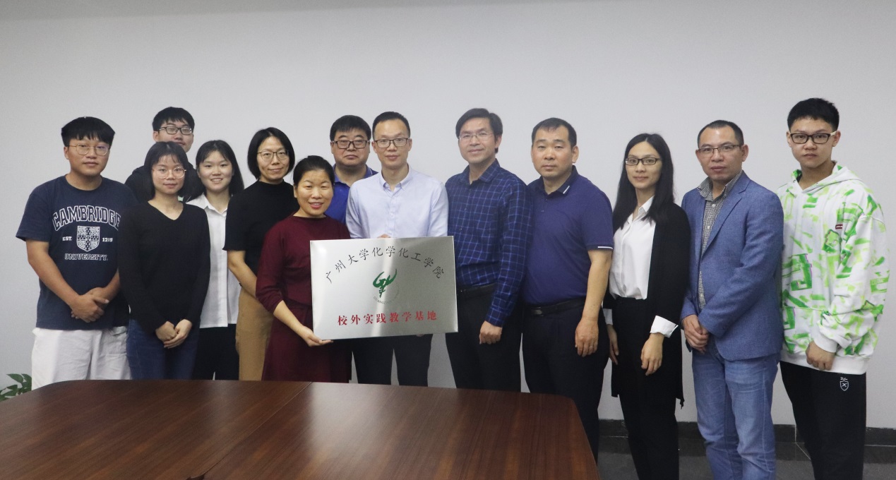 化学与化工学院校外实践教学基地的授牌活动。参加授牌活动还有清远市人才驿站主任唐永红、华南863科技创新园汤汉良高工、化工清远高新区科技产业协同创新平台副总经理陈之善和实习学生。