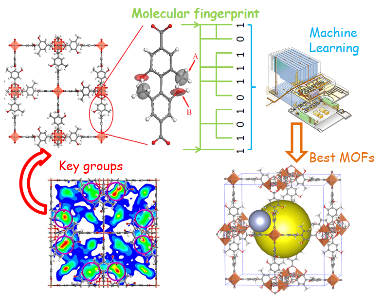 该工作利用计算筛选技术计算了45种功能化的单一手性金属有机骨架(FHMOF)的手性分离能力。FHMOF对(R,S)-1,3-二甲基-1,2-丙二烯的对映选择性随着温度的升高而提高。提出了“手套效应”来解释手性口袋中的官能团的空间效应与FHMOF性能之间的关系。并利用机器学习(ML)技术和分子指纹(MF)技术,设计了85种新型FHMOF,它们的对映选择性可提高到85%。利用ML和MF结合的设计原理及其得到的新的手性口袋有助于开发新的手性分离材料。