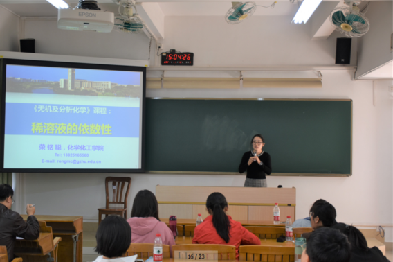 荣铭聪老师的课程讲的是无机及分析化学中稀溶液的依数性。荣老师的教学内容充实,信息量饱满,教学过程安排合理,语速节奏恰当,将依数性概念讲述得具体易懂,十分具有感染力,符合当今学生的学习特点。