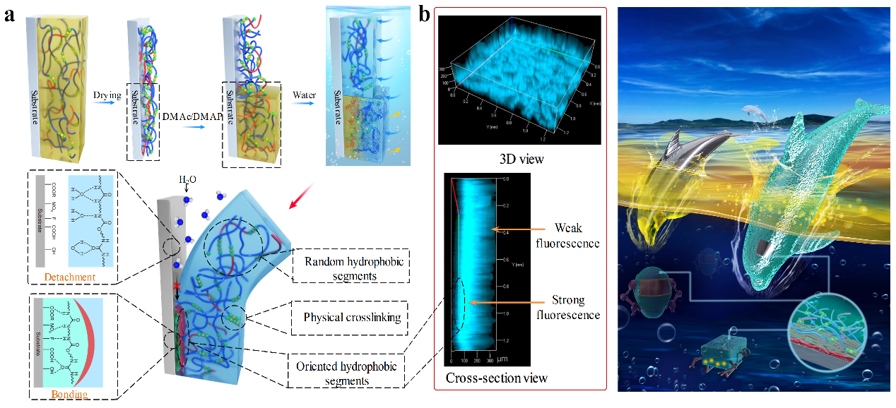 、广东省节能环保精细化学品工程技术研究中心的吴旭副教授团队针对水下防油粘附涂层材料的工程应用难题,围绕聚氨酯两亲分子特定结构与应用功能,提出了水溶性溶剂渗透驱动亲疏水链段在水凝胶超亲水表层和基材附着底层的取向排列新机理,实现了一步溶剂置换涂装工艺下的水下超疏油涂层与各类基材之间的高附着性,从材料合成到涂装工艺为水下防油粘附涂层材料的大面积制备和工程应用提供了简易、通用、可工业化放大的可行方案。