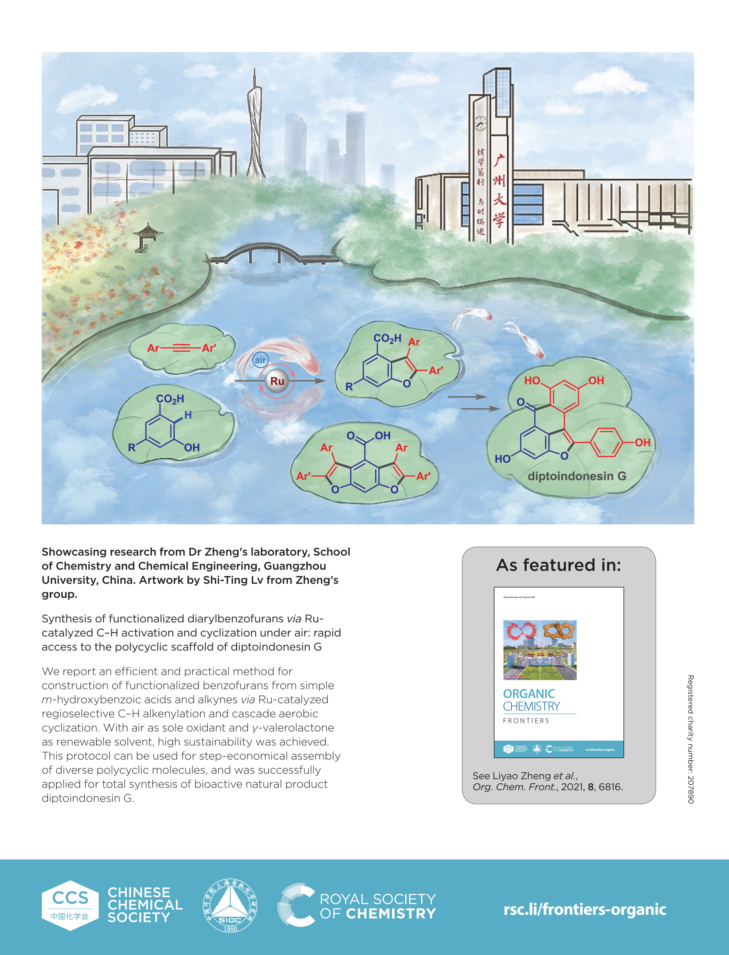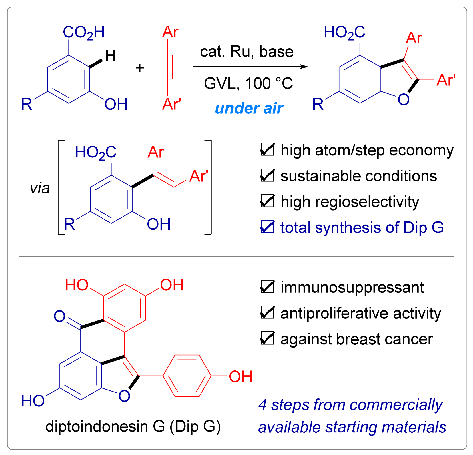 郑李垚副教授团队报道了一类新型钌Ru催化反应,从简单易得的间羟基苯甲酸和二芳基炔烃出发,合成了一系列多取代、官能化的苯并呋喃分子。该反应普适性强、选择性高,且操作便捷,对水和氧不敏感,能放大至克级规模合成。该反应使用生物质基γ-戊内酯作为溶剂,空气作为温和的氧化剂,具有很高的原子和步骤经济性,符合绿色化学和精准化学的发展要求。