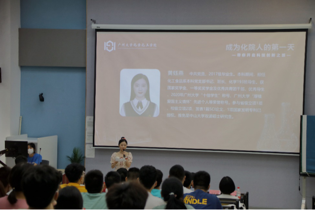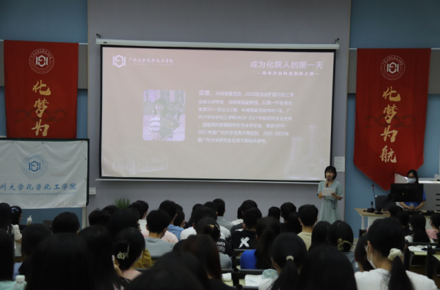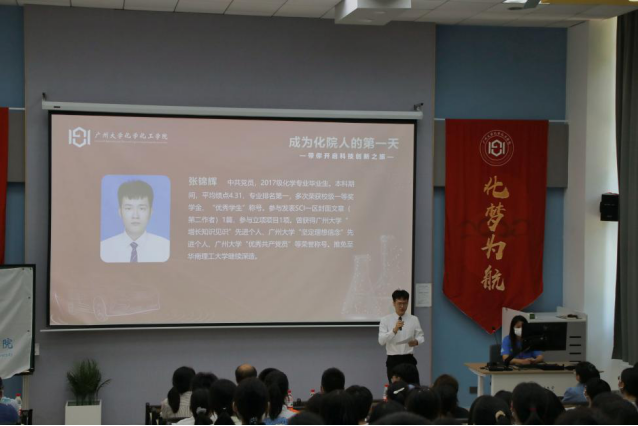 “优秀共产党员”张锦辉分别在本科生会场为新生同学们分享学习经验。会上,两位分享者结合自身经历,讲述了从科研小白到圆梦十佳的成长经历,分享了研究生生活的感悟与目标。