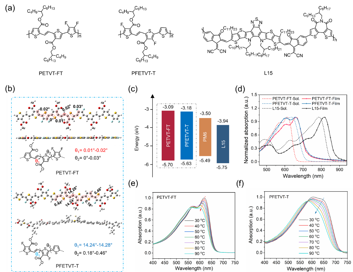 图2.(a)聚合物PETVT-FT,PFETVT-T和L15的分子结构;(b)聚合物PETVT-FT和PFETVT-T理论模拟;(c)聚合物能级;(d)聚合物在溶液和薄膜状态下的紫外吸收光谱;(b)聚合物PETVT-FT和PFETVT-T在溶液状态下随温度变化的紫外吸收。