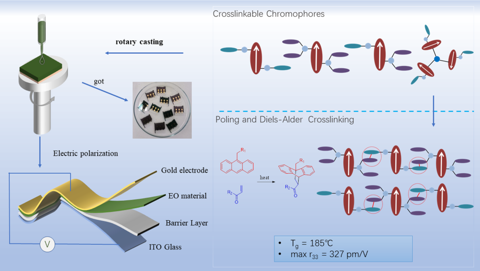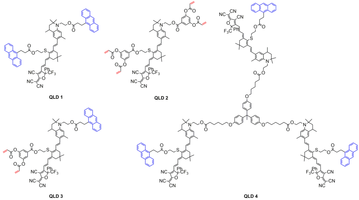 针对这一难点,刘锋钢博士首次提出了二元交联材料的解决方案:将可以交联的蒽和丙烯酸酯基团修饰到发色团QLD1-QLD4的电子给体和电子桥上,发色团在电场的作用下发色极化取向,温度进一步升高,交联反应发生,以网状聚合物的形式固定住已经取向的发色团分子,光热稳定性大幅提升。此外,由于没有小分子/聚合物交联剂的存在,发色团含量高达100wt%,电光系数大幅提升。