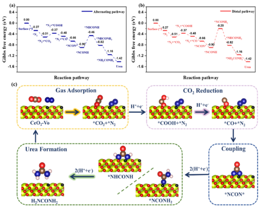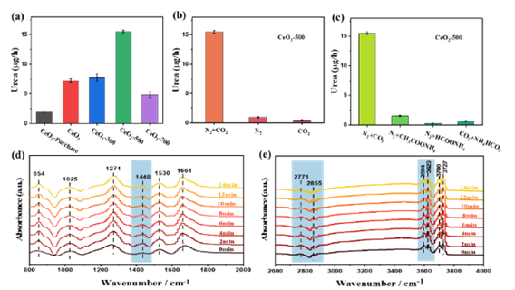 分析科学技术研究中心(Centre for Advanced Analytical Science,CAAS)韩冬雪教授团队近期探索建立了双核Ni2位点修饰的MOF衍生ZnO@NC异质结(ZnO@NC-Ni2)、基于贵金属纳米粒子(Pd、Au和Pt)与介孔TiO2纳米棒(NRs)半/全封装结构非均相催化剂等研究体系,有效实现了温和条件下N2的高效固定。另外利用一种具有氧空位浓度可调的CeO2-x光催化剂,可直接用于温和条件下N2& CO2的协同光催化反应以合成尿素,氧空位的引入进一步增强了该光催化剂对惰性气体N2和CO2的靶向吸附和活化能力,同时提高了材料整体的光生电子转移效率,从而提升其对尿素合成的催化活性。研究中还深入探讨了载流子的迁移及作用机制和碳/氮转化路径,并揭示了C-N偶联反应机理。