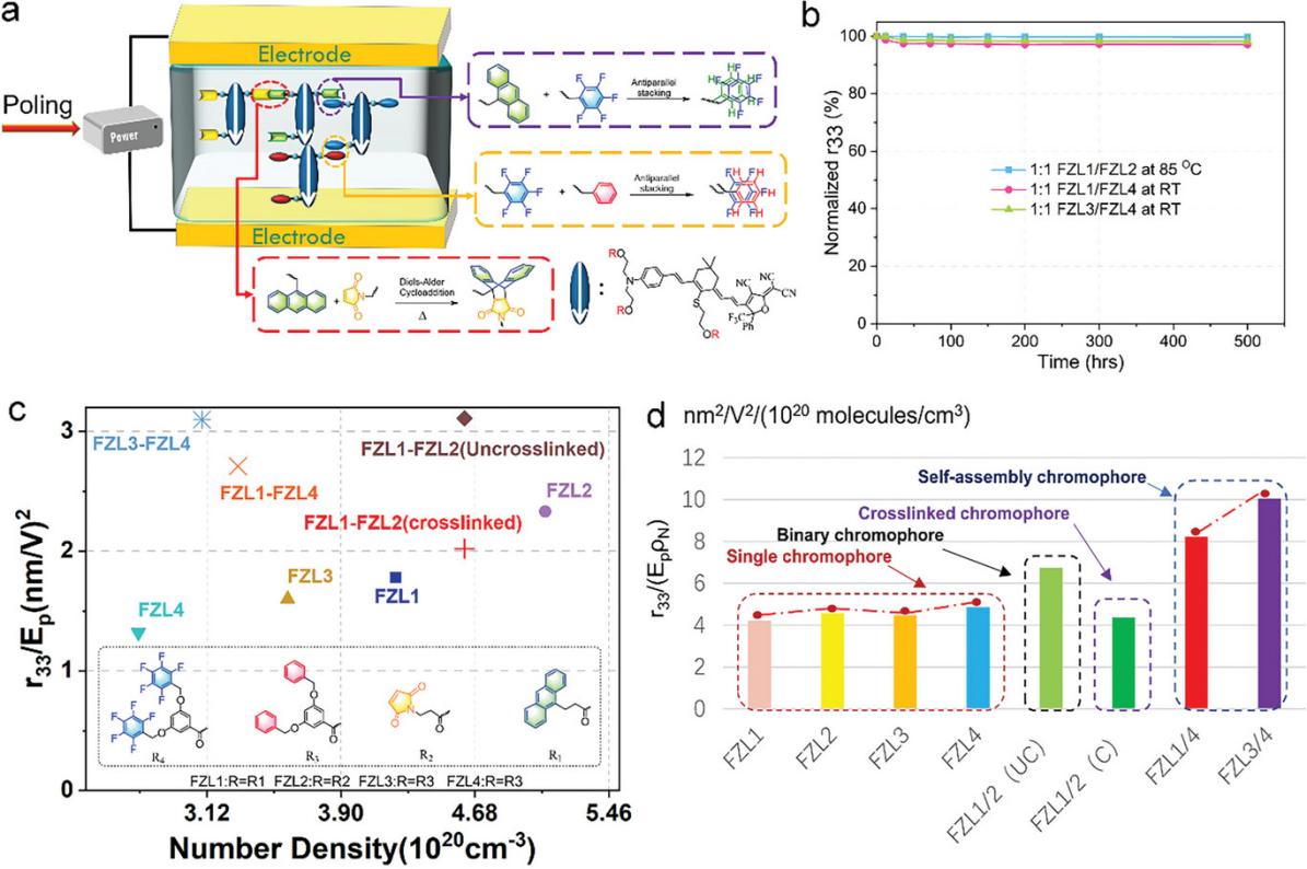 开发了蒽-马来酰亚胺Diels–Alder(DA)反应以及蒽-五氟苯和苯-五氟苯基的π–π相互作用,以制备高效的二元可交联/自组装树枝状发色团FZL1-FZL4。电场极化取向后,DA反应或π–π相互作用形成共价或非共价交联网络,极大地提高了材料的长期取向稳定性。交联膜FZL1/FZL2的电光系数高达266 pm V−1,玻璃化转变温度高达178°C,自组装膜FZL1/FZL4和FZL3/FZL4由于发色团密度高(3.09–4.02×1020分子cm−3)而达到272–308 pm V−1。长期取向稳定性测试表明,在85°C下加热超过500小时后,极化交联电光膜1:1 FZL1/FZSL2保持了99.73%的初始r33值。极化自组装电光膜1:1 FZL1/FZL4和1:1 FZL3/FZL4在室温下放置500小时后,仍能分别保持原电光系数的97.11%和98.23%以上。该材料优异的电光系数和稳定性表明了有机电光材料的实际应用前景。