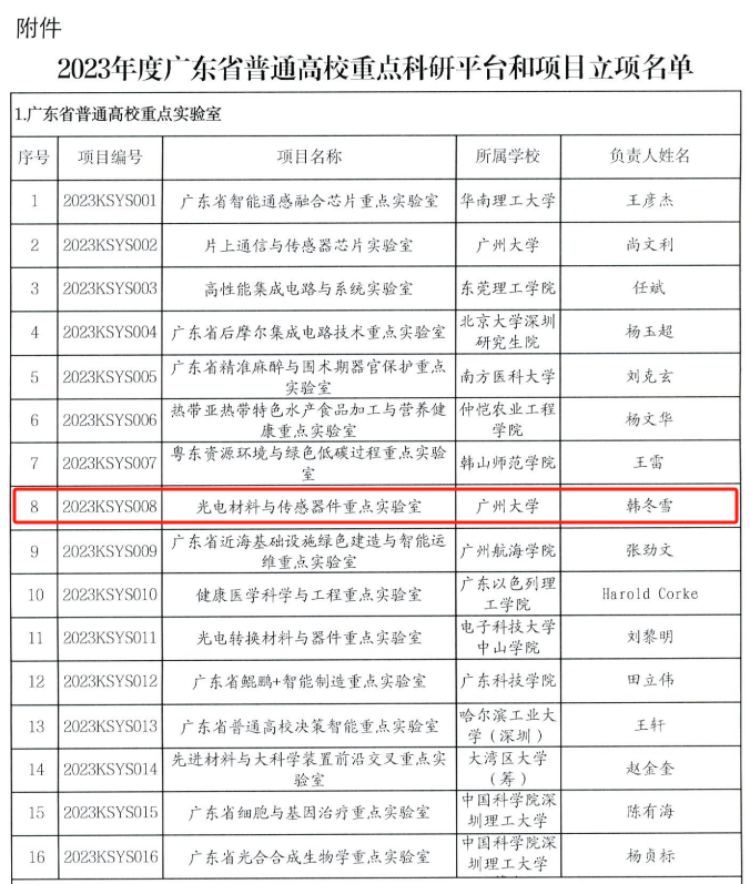 韩冬雪教授申报的“光电材料与传感器件重点实验室”获批立项。