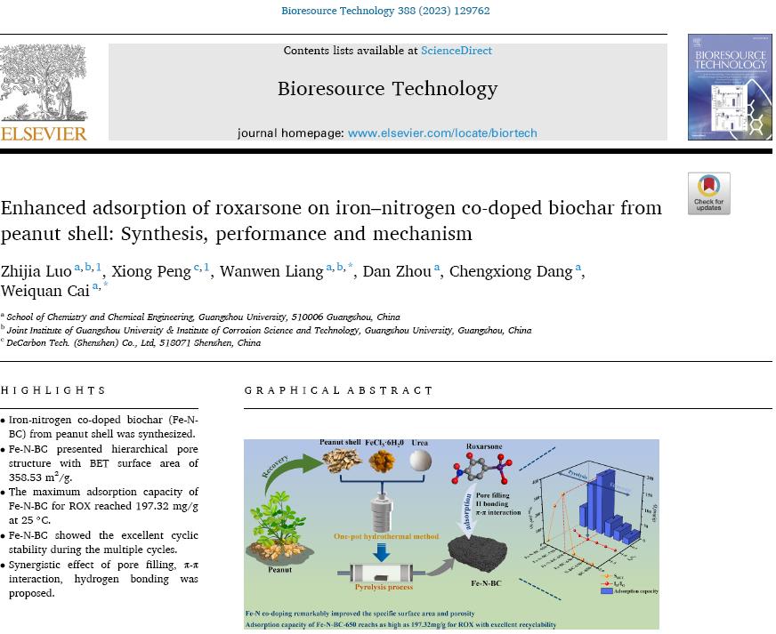 蔡卫权教师团队在工程技术领域著名期刊《Bioresource Technology》(中国科学院大一区,IF= 11.4,Top期刊)发表了题为“Enhanced adsorption of roxarsone on iron-nitrogen co-doped biochar from peanut shell: synthesis, performance and mechanism”的研究论文。该团队梁菀纹博士后和蔡卫权教授为通讯作者,硕士研究生罗志佳为第一作者,av电影