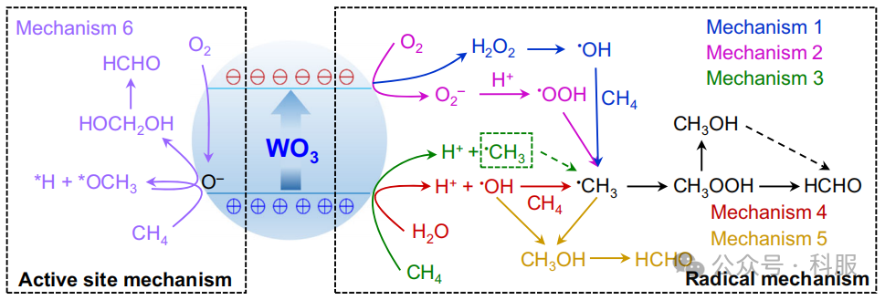 三氧化钨已被公认为是甲烷高选择性氧化制甲醛最有前途的光催化剂,但其催化活性的来源和反应方式仍存在争议。本文以{001}和{110}晶面为主的三氧化钨为模型光催化剂。值得注意的是,{001}面可以很容易地通过活性位点机制实现甲醛的100%选择性,而{110}面很难通过自由基方式保证甲醛和许多中间产物的高选择性。原位漫反射红外傅里叶变换光谱、电子顺磁共振和理论计算证实,甲烷和水在三氧化钨表面的竞争性化学吸附和不同的甲烷活化途径是导致不同甲烷氧化途径的原因。微观机理的阐明为设计高性能甲烷选择性氧化光催化剂提供了指导。