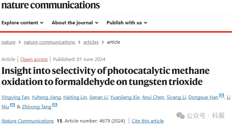 牛利教授/韩冬雪教授在国际知名期刊《Nature Communications》上发表了题为“Insight into selectivity of photocatalytic methane oxidation to formaldehyde on tungsten trioxide”的研究论文。