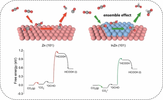 图1:单金属Zn和双金属In-Zn活性位点对比,进而调控CO2RR制HCOO-反应路径示意图。