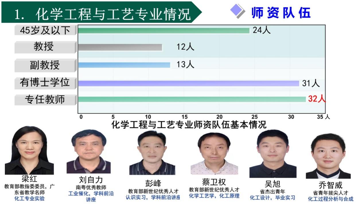 本专业所依托的化学工程与技术学科为省优势重点学科,拥有国家高等学校化学化工实验教学示范中心、省工程技术中心、广州百花香料股份有限公司省级工程实践教育中心、省级产学研实践基地等平台。拥有国家虚拟仿真实验教学一流课程1门,化学工艺学、化学反应工程、化工专业实验和化工热力学省级一流课程4门,化工原理、化学工艺学和化学反应工程等省级精品或在线开放课程3门,省级课程思政示范课堂1门。本专业所在单位是国家教育部化工类专业教学指导委员会委员单位,广东省化工与制药类专业教学指导委员会副主任单位,中国化工学会常务理事单位、广东省高校化学化工学会理事长单位。