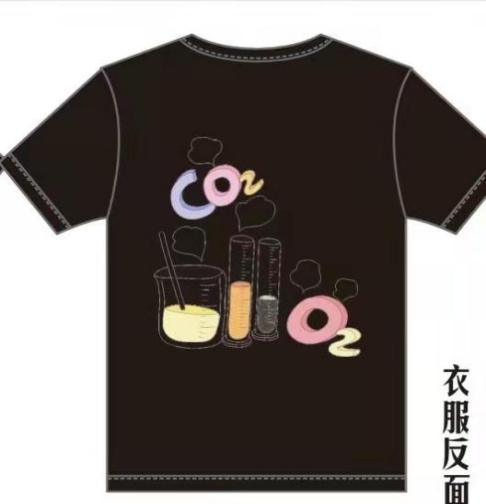 班服理念:本班服是简单的圆领宽松款式,以纯黑色作为底色,简洁大方。主要的代表性Logo印于左胸口以及右袖上,Logo是本班同学的手工彩绘设计,风格别具特色。以“花”代“化”,有两个寓意,其一代表我们化工202班虽是理工科,但也敢于打破传统的刻板观念,即善于创新;其二,“花”代表着我们班每一个人都是祖国之花朵,国之栋梁。背面的图案则是由典型的化学仪器和化学物质组成,巧妙地展示出我们化学的无穷魅力;背面的图案风格也是彩绘风,与主体设计相呼应,达到整体上的统一。