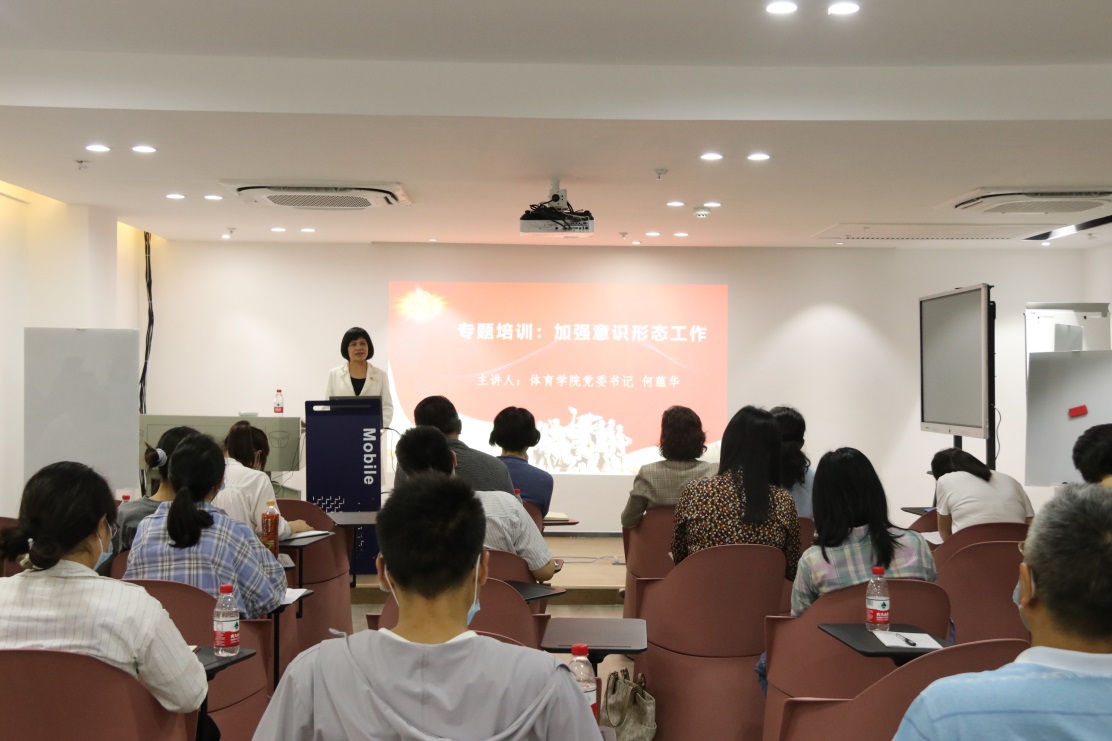 体育学院党委书记何蕴华以“加强意识形态工作”为主题做专题培训。何书记通过实际工作中的案例阐述了意识形态工作的重要性,引导党务干部做到以下几点:一是正面引导,主动作为。要增强政治责任感和使命感,坚持围绕中心、服务大局,做好正面舆论引导,站稳守好意识形态阵地;二是精准管控,责任落实。抓好制度建设、队伍建设、规范管理;三是问题导向,把握时效。要有危机意识,善于发现问题,勇于直面问题,迅速解决问题,切实增强工作的主动性、预见性,牢牢把握意识形态工作的领导权、主动权。