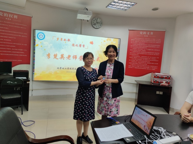 仪式上,分工会主席郭云萍老师为荣退教师送上鲜花及退休礼物,周海兵书记为李楚英老师赠送化院院徽纪念章,李老师也幸运地成为了院徽纪念章的第一个拥有者。